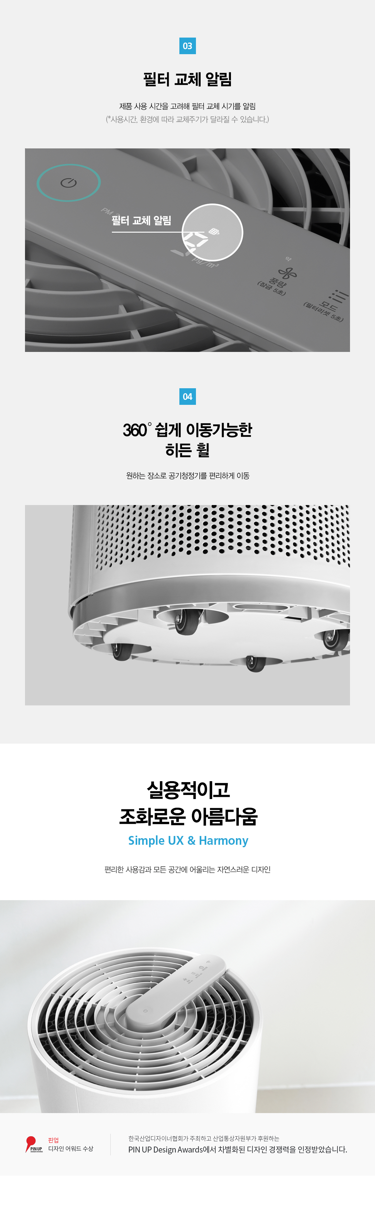 필터 교체 알림, 360도 쉽게 이동이 가능한