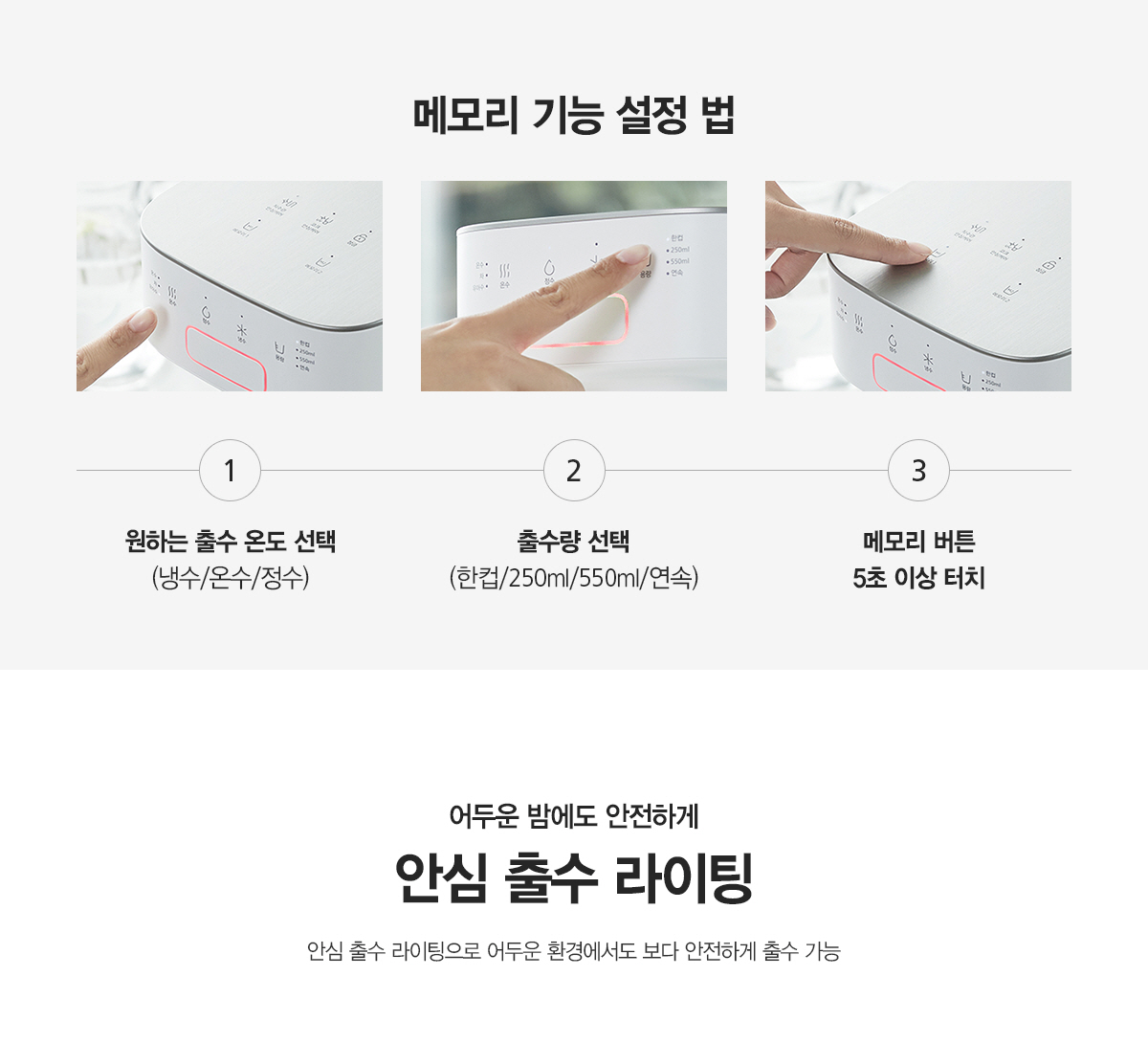 원터치 정량 출수 기능과 온수 3단게 기능이 있어요