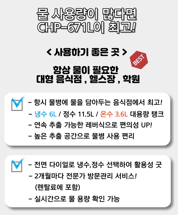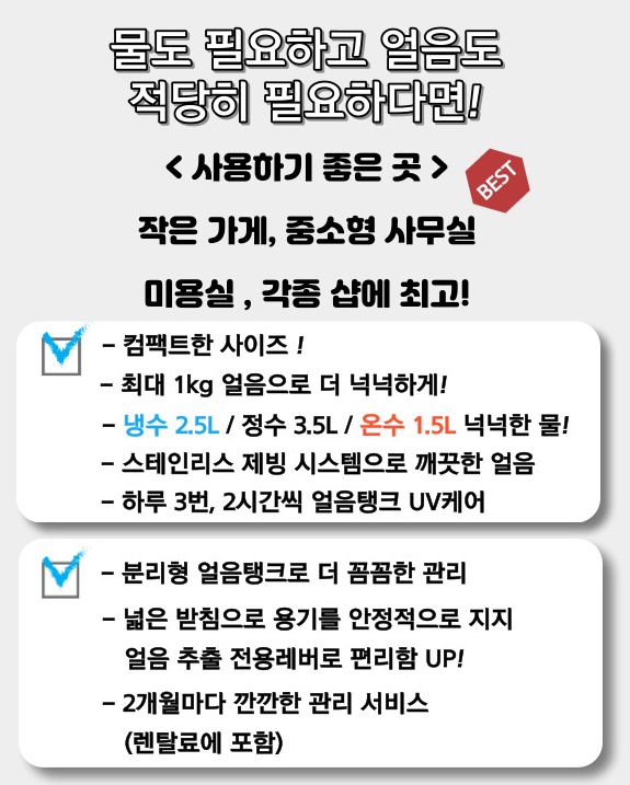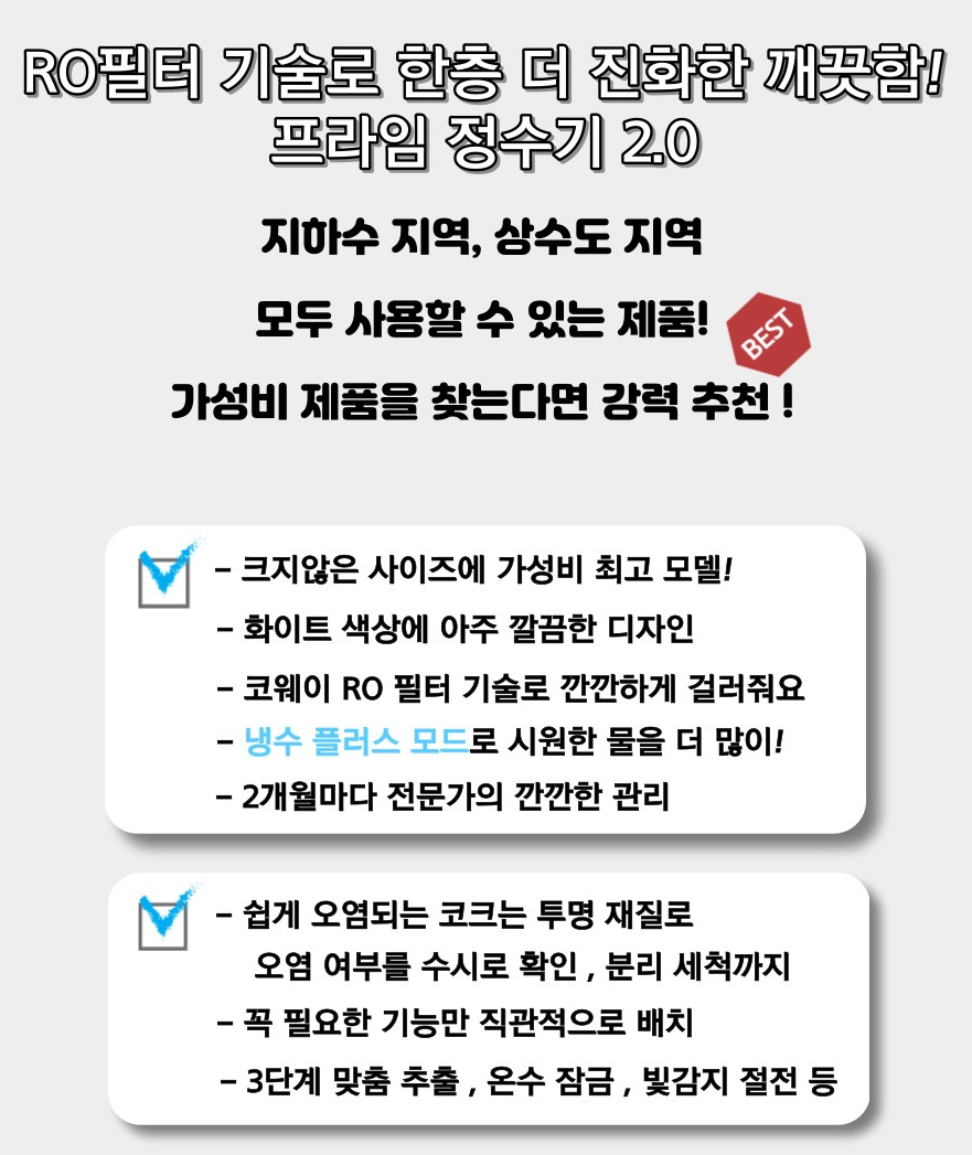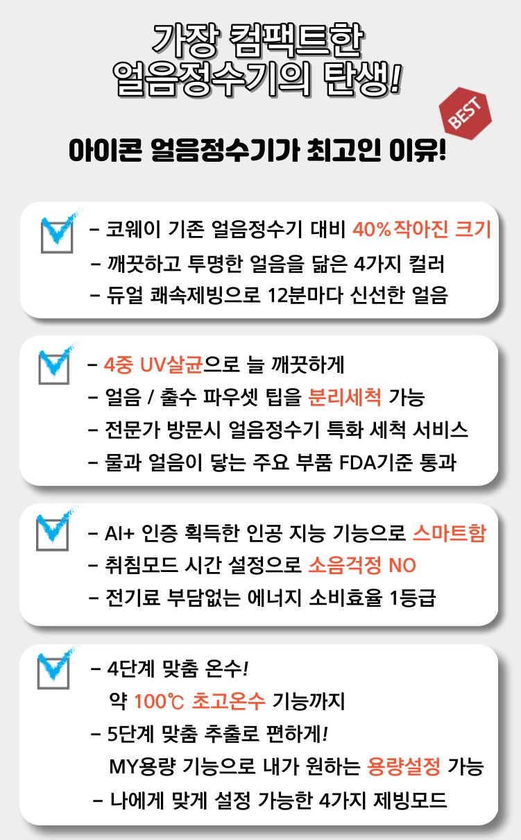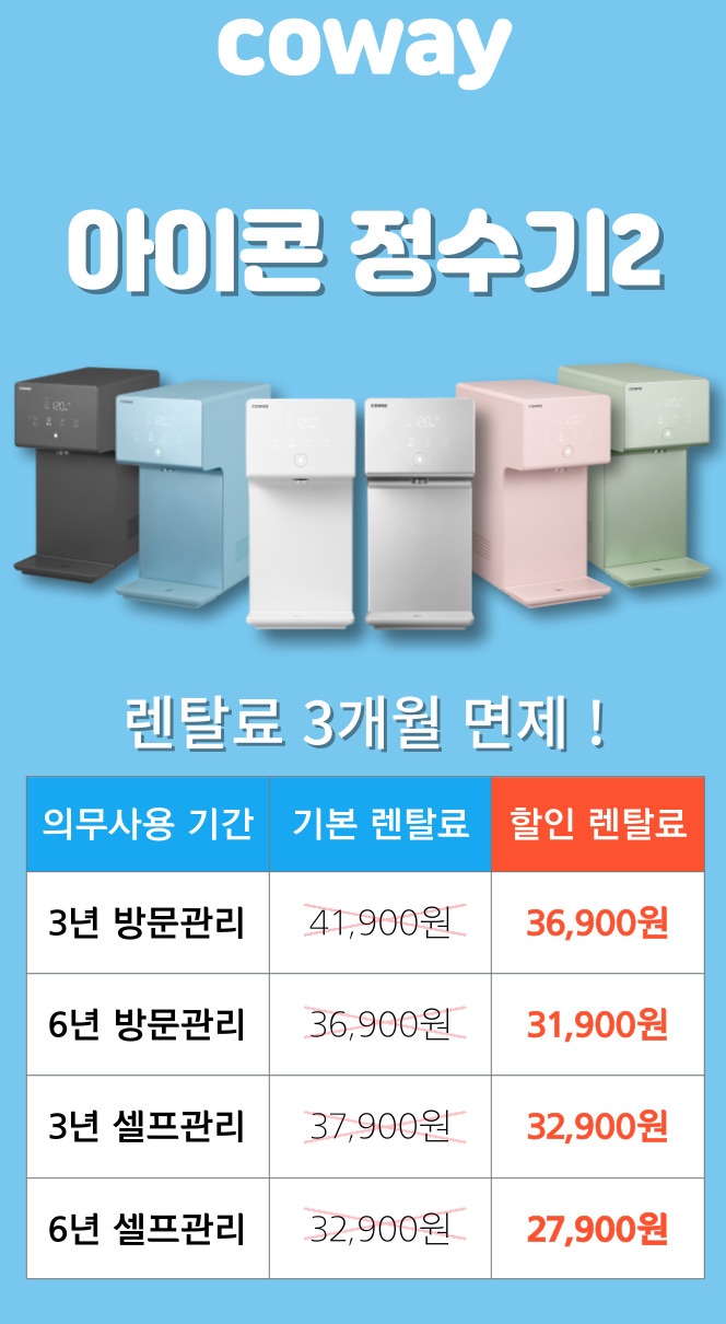 안녕하세요! 코웨이에서 아이콘 정수기가 최고의 인기를 누리고 있었는데요 이번에 더 새롭게 아이콘정수기2가 출시되었어요! 제가 포스팅을 하기 위해서 한번 살펴봤는데 진짜 기능 대박이고 어떻게 이렇게 더 완벽하게 출시될 수 있는지 역시 코웨이구나! 라고 생각이 들었는데요! 그래서 오늘 여러분들과 함께 아이콘정수기2의 새로워진 점들을 함께 알아보려고 합니다! 요즘 일상생활에 편리함을 주는 가전들이 많아지게 되면서 주방에 놓을 가전들도 다양해졌는데요. 그 중에서도 저는 정수기가 가장 중요하고, 또 가장 많이 찾는 주방 가전이라고 생각을해요! 그래서 코웨이에서는 필수적인 정수기를 설치하면서도 주방 공간이 더 여유로울 수 있도록 크기가 정~~말 작은 정수기인데요! 놀라지마세요! 정수기 깊이 사이즈가 25cm밖에 되지 않아요! 어떻게 이렇게 작게 만들었을지 대단하다고 느껴지네요. 정수기에서 가장 오염되기 쉬운 부분이라고한다면 공기나 먼지가 맞닿을 수 있는 파우셋인데요. 그래서 살균-세척-교체 3단계 완벽한 파우셋 위생관리가 이루어집니다. 사용자가 따로 신경을 쓰지 못하더라도 정수기가 알아서 살균을 해주는데요! 물을 추출 후 매번 살균을 해주고 취침시간이나 외출때에 정수기를 사용하지 않아도 6시간마다 알아서 UV 살균을 해줍니다. 이미지에 보이는것 처럼 파우셋을 정수기 윗면에서 위로 뽑아서 분리할 수 있어서 수시로 세척할 수 있어요 그리고 파우셋 전체는 안전한 트라이탄 소재로 되어있는데요! 이 소재의 장점은 환경 호름 걱정도 없어서 신생아에게도 안전한 친환경 소재이며, 강한 내열성과 내구성을 보여주어 오래도록 깨끗하게 사용할 수 있어요. 기능이 대박인게 원래는 정수기에서 보통 85℃ 정도되는 온수를 사용할 수 있었는데요. 이 때문에 정수기를 통해서 컵라면에 온수를 받을때에 다소 부족한 온도로 덜 익거나하여 제대로 이용하지 못했었는데 이제는 정수기에서 약 100℃의 초고온수도 빠르고 풍부하게 이용할 수 있어서 단점을 없애주었습니다! 초고온수 뿐만 아니라 4단계 맞춤 온수로 되어있으며 용량 맞춤 출수도 my용량이 추가되어 총 5단계 정량 출수가 가능합니다. 정수기 관리가 더욱 쉬워진 이유는 주요 부품은 원터치로 간단하게 교체할 수 있으면서 필터 교체 주기와 필터세척은 정수기가 알아서 다 해주기 때문인데요! 정수기에서 가장 중요한 필터 관리를 할때에 사용자가 따로 신경쓰지 않고 있어도 필터교체주기를 정수기가 파악하여 안내해줍니다! .주기적으로 필터를 교체해주면서 깨끗한 수질을 유지할 수 있으며 자가관리 후 폐필터도 알림톡으로 회수 신청을 하면 코웨이가 무상 방문 수거를 도와줍니다. 그리고 평상시에 제품에 이상이 있는지 없는지 수시로 확인할 수 있도록 준비되어있는데요! 만약에 자가관리를 하면서 제품의 이상이 발견되면 간단한 해결방법을 안내해주어 일일이 A/S를 신청할 필요가 없으며 해결되지 않는 고장일 경우에는 센서로 감지한 고장 부위를 고객센터에서 미리 알고있어 신속하고 정확한 A/S 접수가 이루어집니다. 냉수 추출 방식은 컴프레서를 없애고 전자 냉각 시스템으로 되어있어서 조용하게 냉각하여 출수되기 때문에 생활소음도 걱정없으며 온수도 순간 가열로 빠르게 가열하여 에너지도 절감해주고 4단계 온수 기능도 바로바로 이용해볼 수 있어요! 그리고 정수와 온수는 직수이면서 냉수는 저수조 방식이며 물이 닿는 부분이 안전한 소재이기 때문에 걱정없고 냉수를 더 빠르고 풍부하게 출수해주어 코웨이만의 시스템으로 되어있습니다. 김천코웨이정수기렌탈을 이용하면서 믿을 수 있는 품질은 물론 최고의 서비스와 함께 해볼 수 있는데요! 관리 방식도 고객의 사용 스타일에 따라 선택할 수 있어요. 문제없이 주기적인 방문관리를 받을 수 있다면 방문관리 약정을 선택하면 좋지만 요즘같이 바쁜 일상속에서 시간이나지 않아 제대로된 관리를 받지 못하는 분들이라면 주요 교체 소모품이나 자가관리키트를 택배로 배송받아서 내가 원하는 시간에 관리하는 셀프관리로 선택하여 늘 깨끗한 정수기로 사용하시면됩니다! 제가 오늘 김천코웨이정수기렌탈 추천을 해드렸는데요! 아이콘 정수기2를 보자마자 기존에도 좋았는데 더 좋아질 수가 있구나 ! 괜히 코웨이가 아니구나 라는 생각이들어서 김천코웨이정수기렌탈 추천을 꼭 해드리고 싶어서 이렇게 준비했어요! 완벽한 위생뿐만 아니라 디자인까지도 더 특별해진 코웨이 정수기를 제휴카드를 활용하면 최소 실적으로도 매달 13,000원을 할인받을 수 있으니 제휴카드도 꼼꼼하게 확인해보셨으면 좋겟습니다!